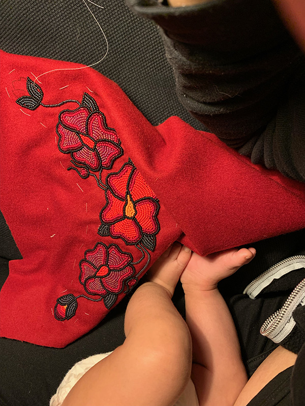 6) Baby feet rest against a piece of beadwork. Red flowers with green leaves embroidered on a piece of red cloth. A thread traces a basting stitch around the outlines of the design.