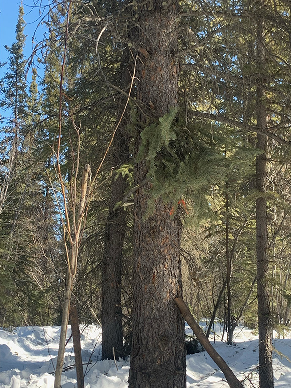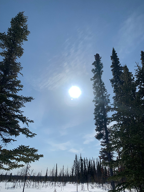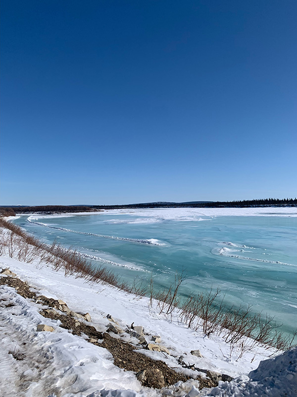There’s a spot on the trail behind the lake that I wanna set up a wall tent so that me and baby can easily walk there and camp out overnight while being close enough to town in case we need anything. I’m nervous to take him too far on a skidoo yet. The cabin me and two friends started building when I was five months pregnant is 14 miles down river. I think I have to wait till he’s a bit older to bring him there even if he’s inside of my parka. So I asked my dad if he could set up a wall tent for me and baby behind the lake in between our houses. And there’s a title of the work. Behind the lake between us.